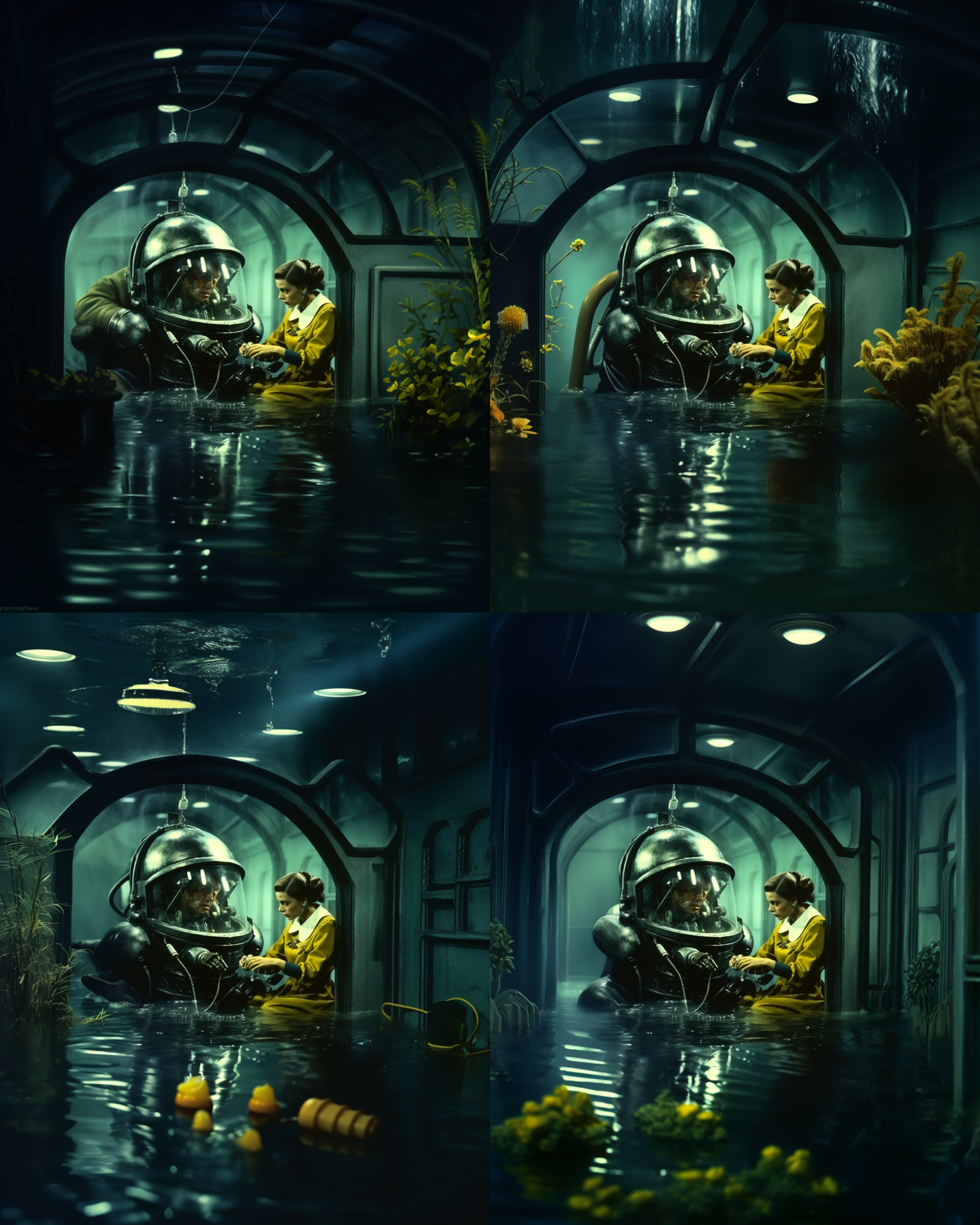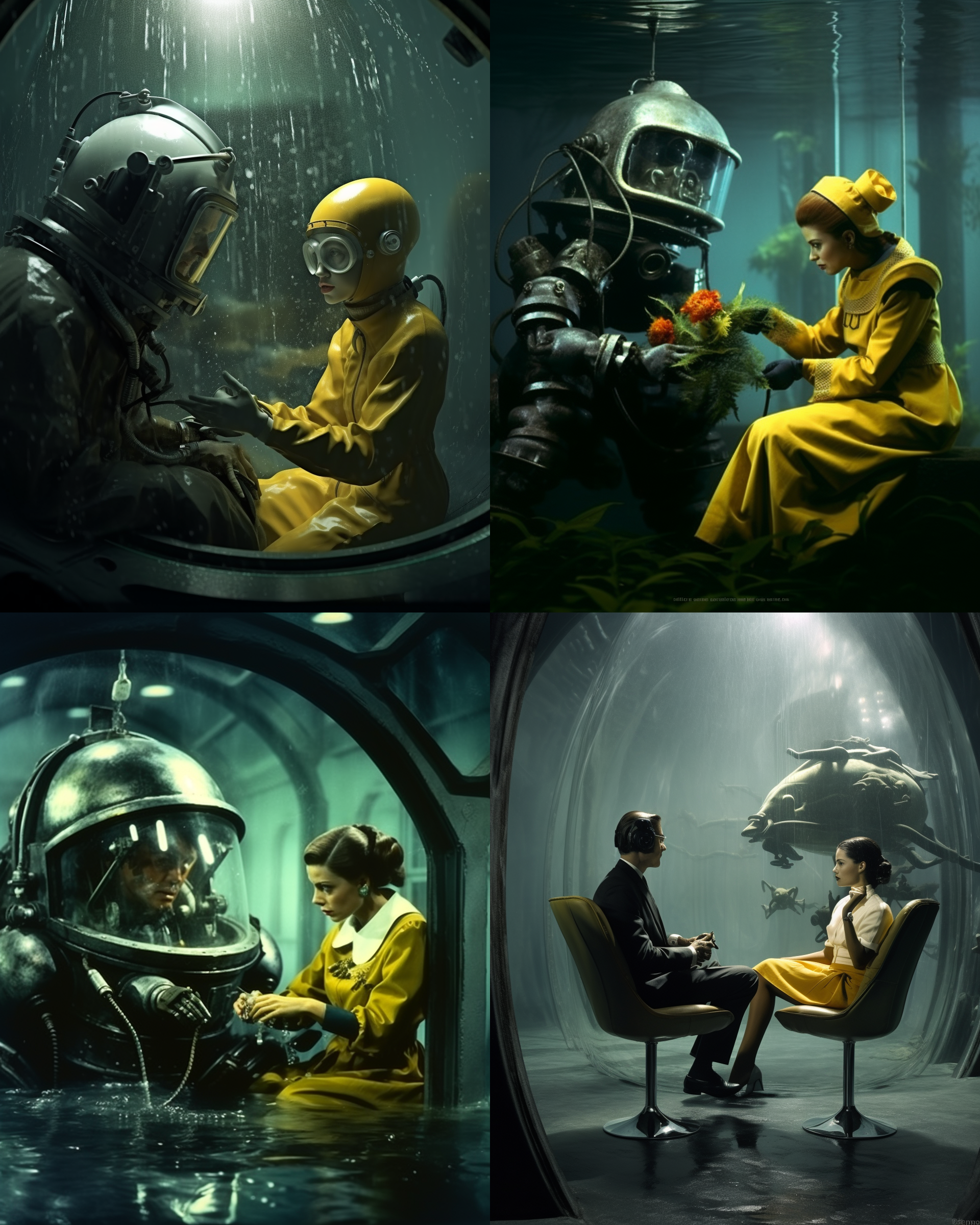 female scientist under the water chatting with her friend, her friends is anthropomorphic living banana, bad weather feeling, Fritz Lang --ar 4:5 --v 5.2 - Variations (Subtle)
